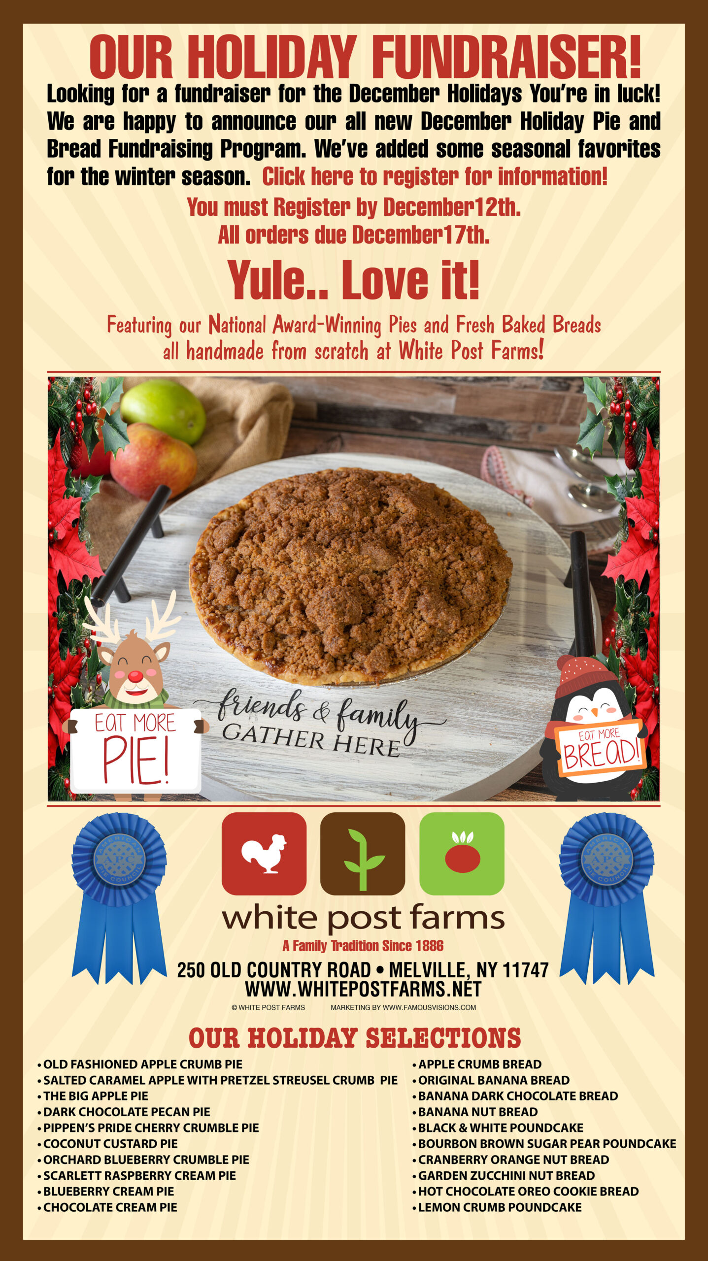 White Post Farms of Melville is well known for its annual Thanksgiving pie fundraiser, a beloved tradition that has become a staple of the holiday season for schools and organizations for over 25 years in the tri-state area! After so many of you asking for it we are ready to be your favorite winter holiday fundraising program as well.