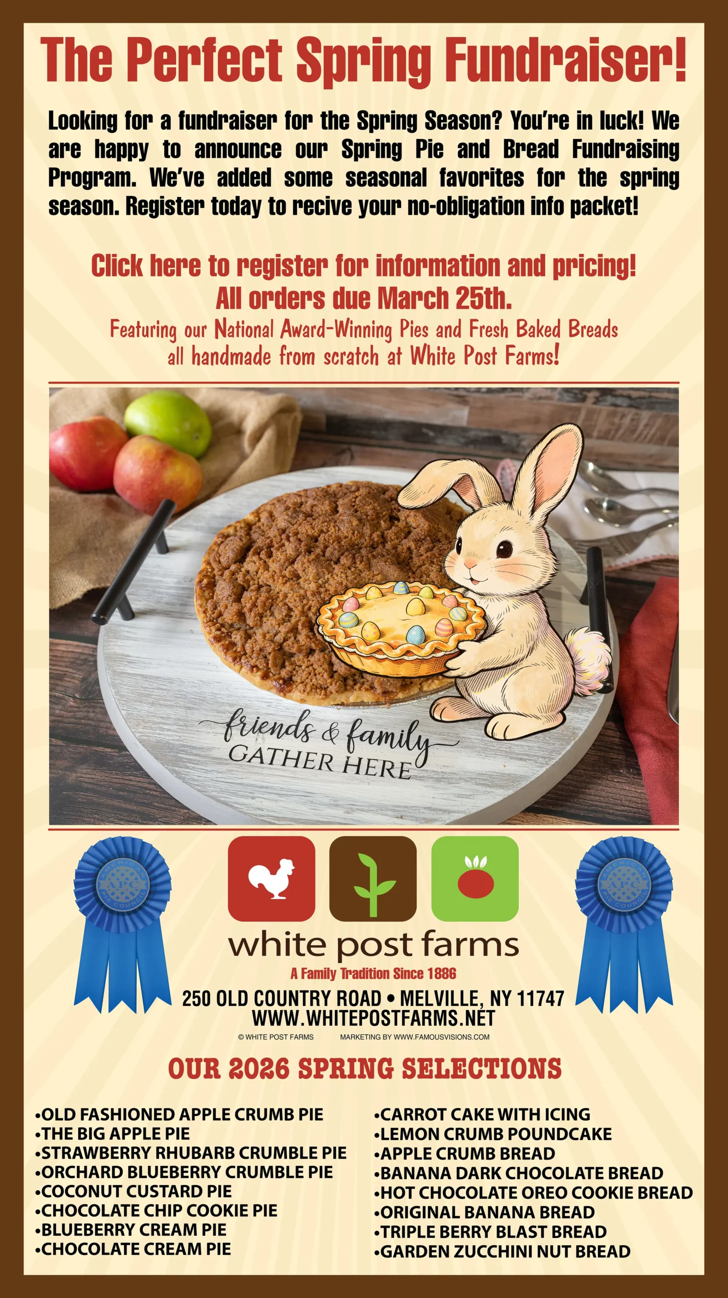 White Post Farms of Melville is well known for its pie and bread fundraiser, a beloved tradition that has become a staple for schools and organizations for over 25 years in the tri-state area!